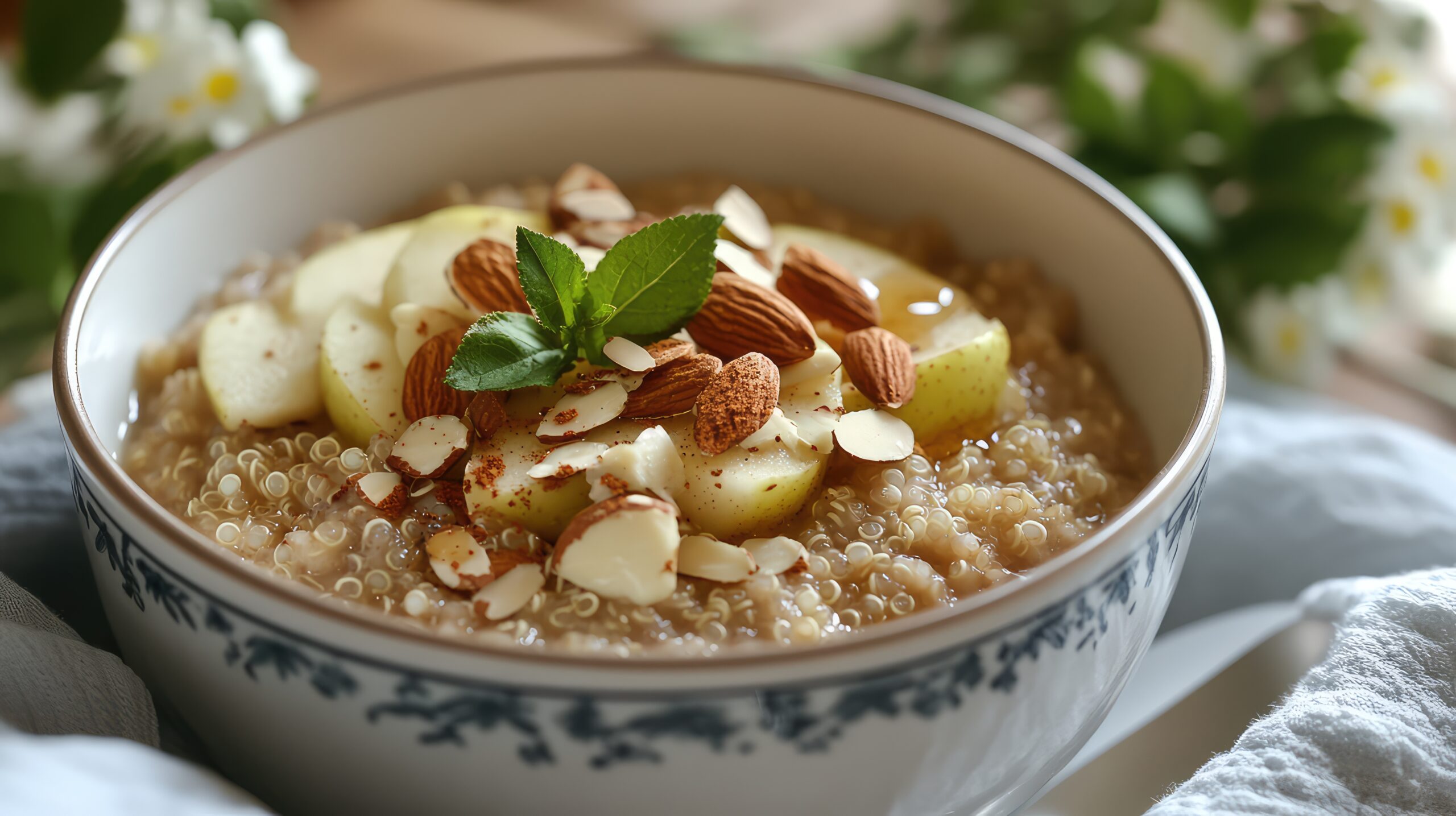 Serves 4 Ingredients 1 cup quinoa 1 cup water 1 cup hemp milk 2 pears, chopped 1 handful of pecans...
