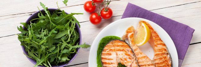 Serves 4 1 large fresh salmon fillet 2 tablespoons ghee, melted 1 clove garlic, minced 1 cup cherry tomatoes, halved...