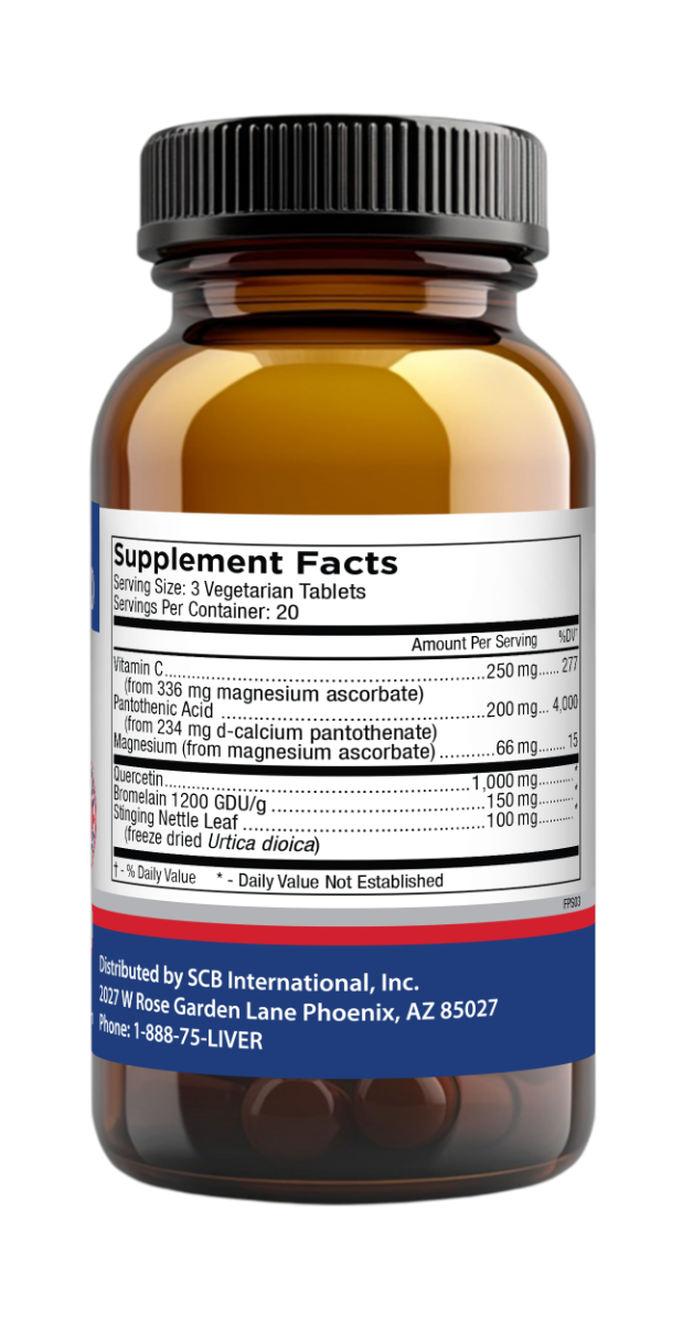 Vitamin C 250mg Vitamin B5 (also known as pantothenic acid from d-calcium pantothenate) 200mg Magnesium (from magnesium ascorbate) 66mg Quercetin (from Dimorphandra mollis seed pods) 1000mg Bromelain 1200GDU/g) 150mg Stinging nettle leaf (freeze dried Urtica dioica) 100mg Other ingredients: Special plant cellulose, Vegetable stearates, Natural silica and magnesium stearates.